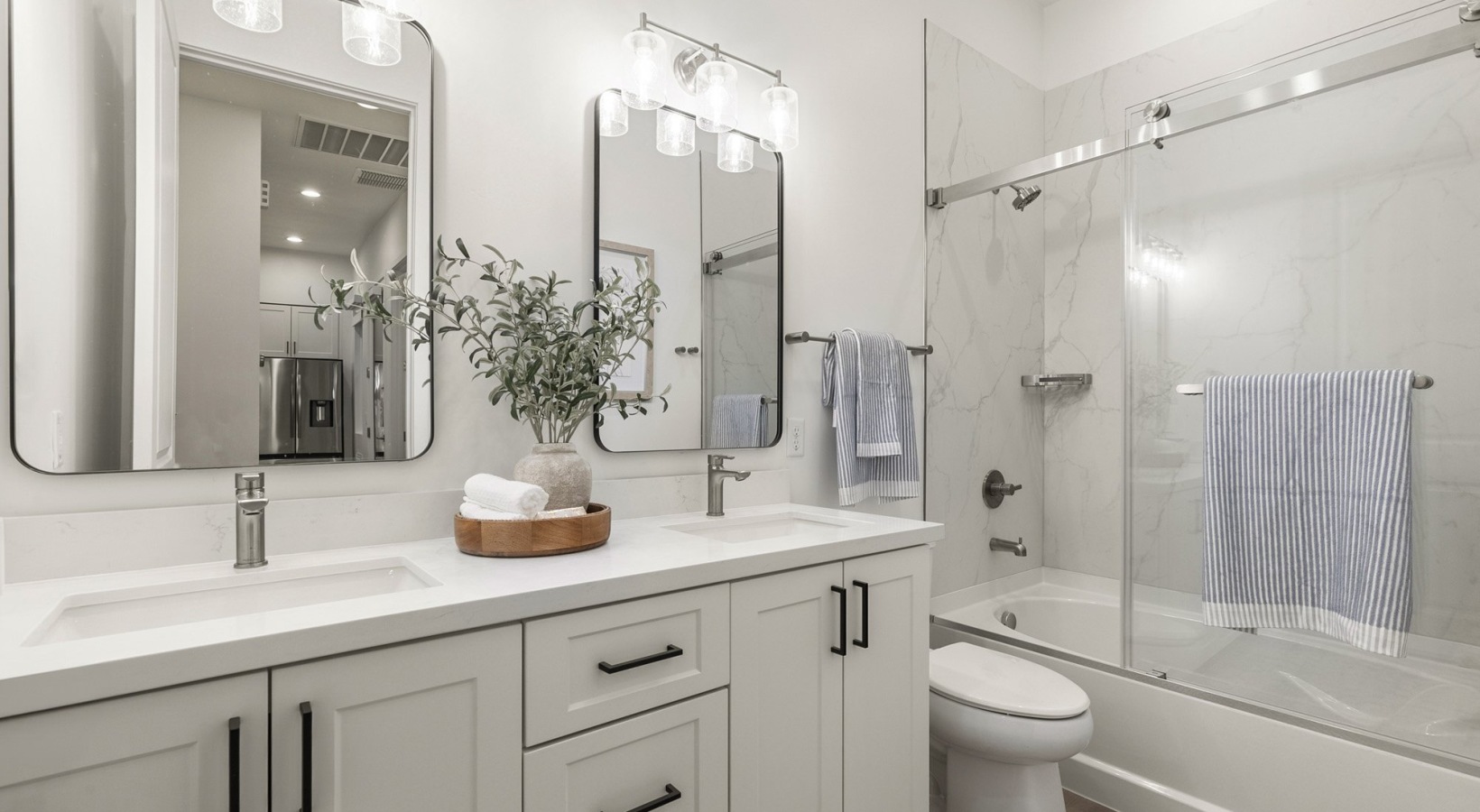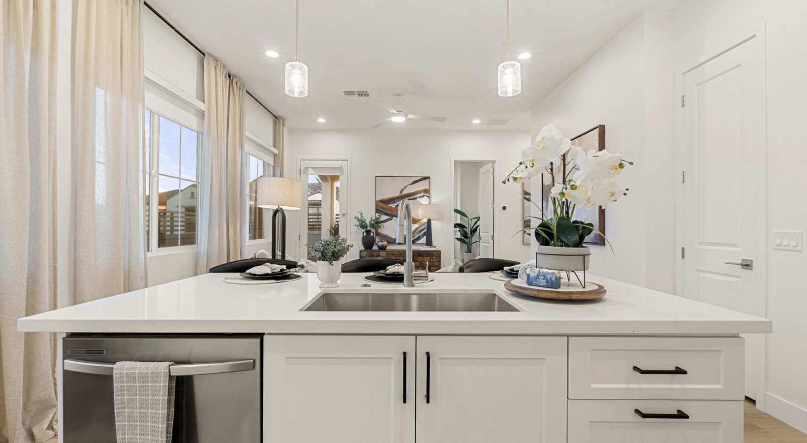 • a kitchen with white cabinets a fridge a stovetop and a dishwasher